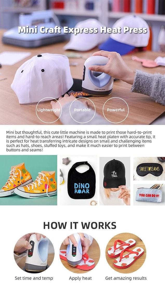 Vi introduserer Mini Craft Express Heat Press, den kompakte og effektive løsningen for dine håndverksbehov. Med varenummeret CEHP0203-LBN er denne allsidige varmepressen designet for å møte kravene til både kreative entusiaster og profesjonelle.