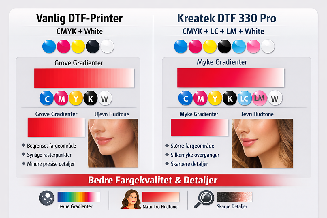 De fleste DTF-printere på markedet bruker kun CMYK + hvit, noe som ofte gir grove gradienter og synlige rasterpunkter i lyse farger.