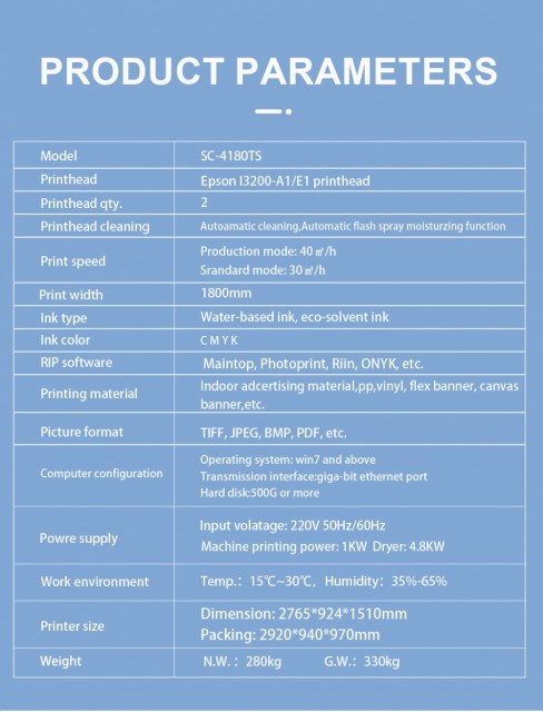 Opplev eksepsjonell utskriftskvalitet med Snika SC-4180TS, en kraftig fotoprinter med to originale Epson I3200-A1/E1 printhoder. Denne storformatmaskinen kombinerer høy hastighet og utsøkt presisjon med slitesterke, profesjonelle komponenter – ideell for både små og store produksjoner innen reklame, interiørdekor, tekstiloverføring og utendørs grafikk.