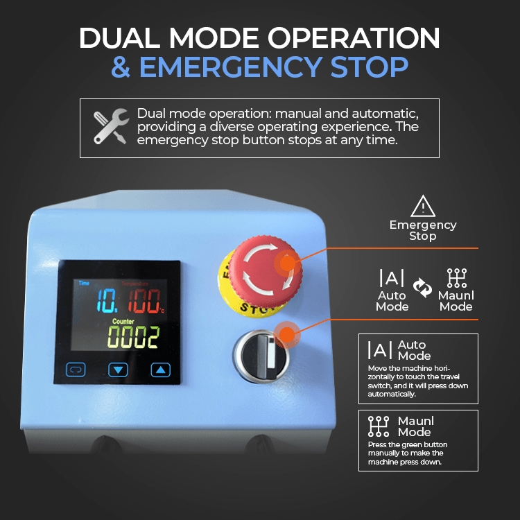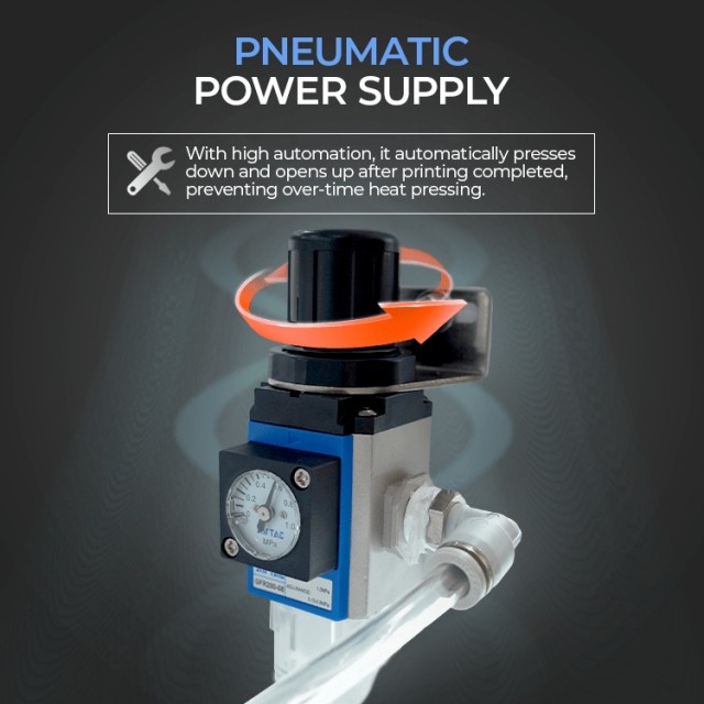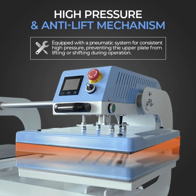 Med Pneumatisk Dobbel Varmepresse får du jevnt og konsistent trykk, rask flyt mellom stasjonene og presis temperaturkontroll for profesjonelle resultater hver gang.