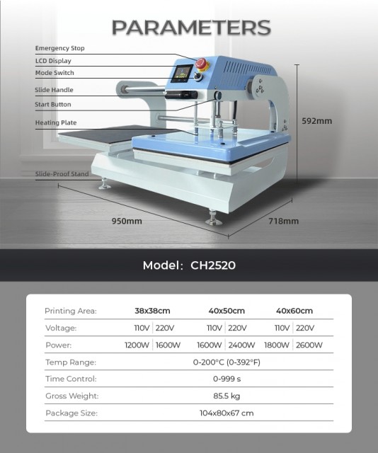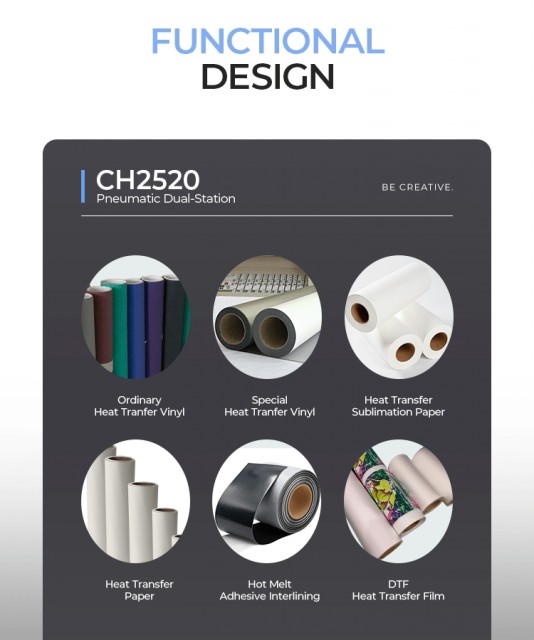 Pneumatisk Dobbel Varmepresse CH2520 kombinerer høy ytelse, brukervennlighet og sikkerhet i én robust maskin. Med fleksible størrelser og kraftig oppbygning er den ideell for DTF, sublimasjon, vinyl og andre tekstiloverføringsmetoder.